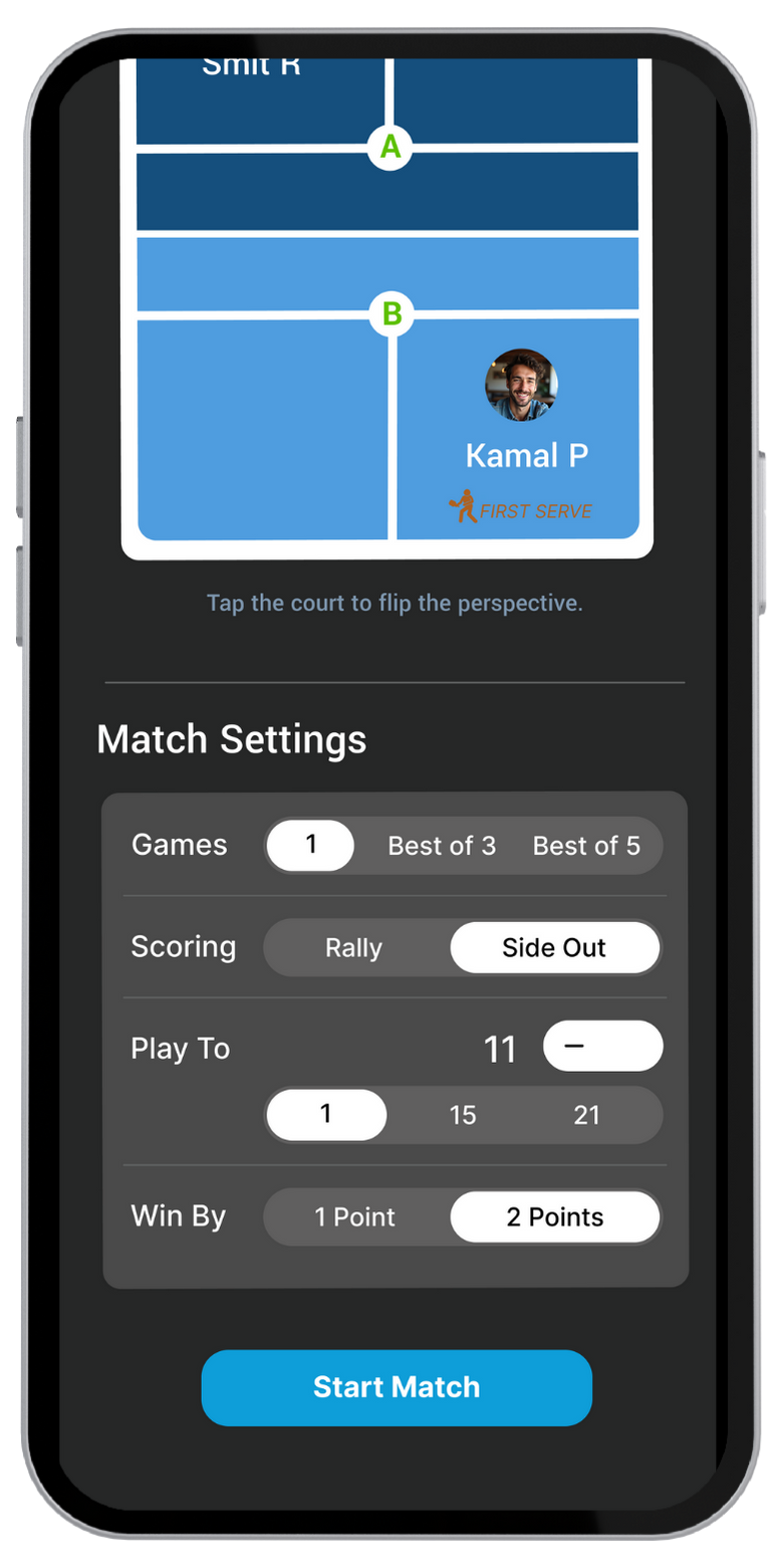 Set up your match in seconds. Choose players, match type, and scoring format.