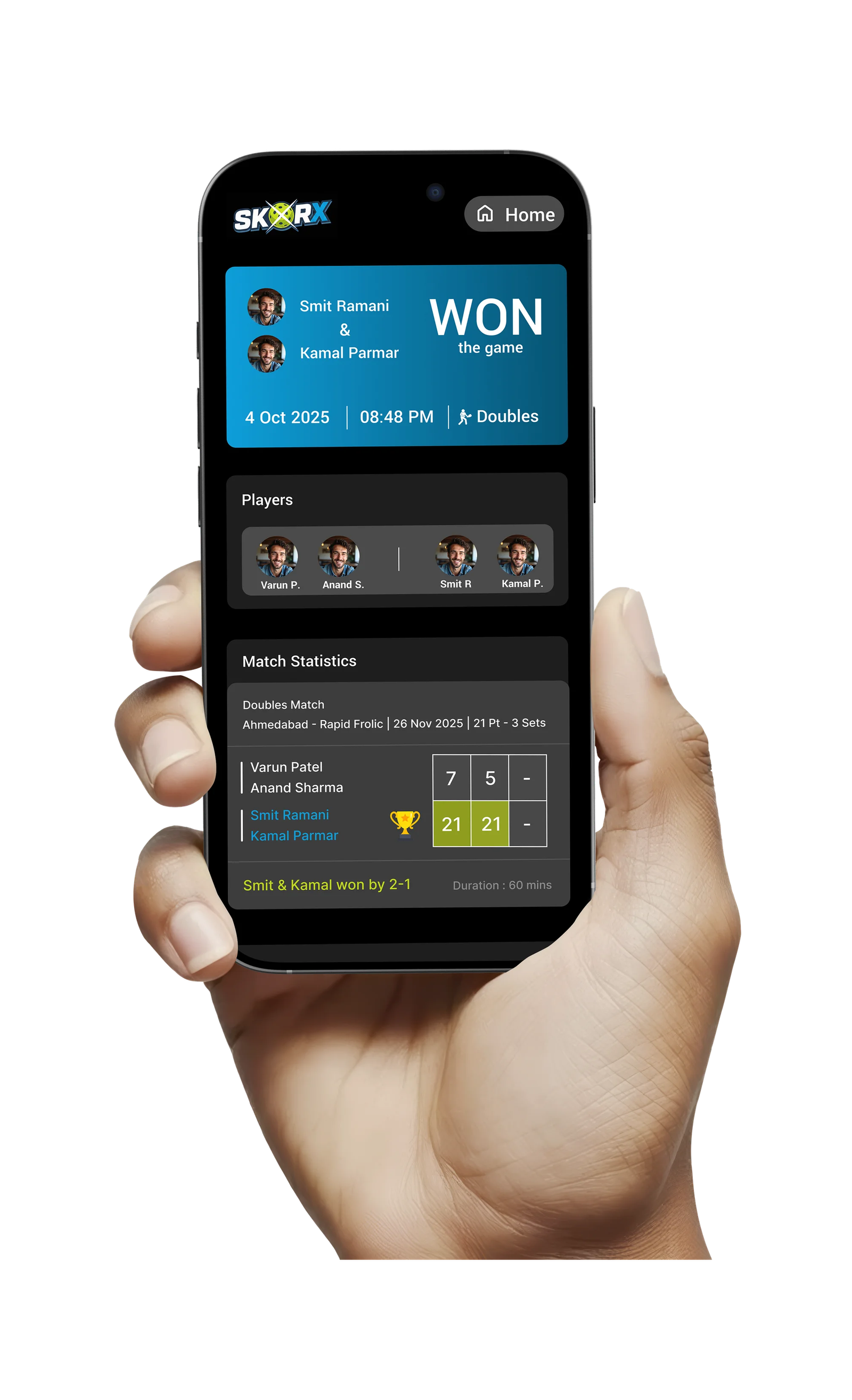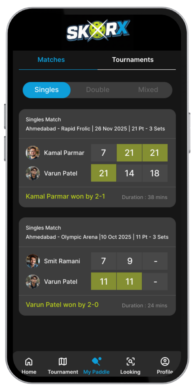 Tap to update the score after every rally. SkorX keeps scoring clear, fast, and accurate.